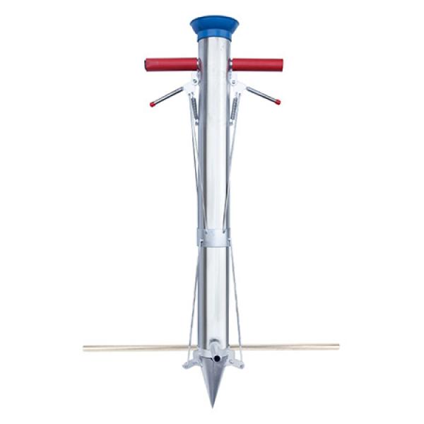 A pair of trowels can penetrate right through plastic mulching as well. In order to operate the tool, drop a seedling into guide tube, push the shut pair of trowels into the soil, grasp the latch and handle together and lift the tool straight up.
